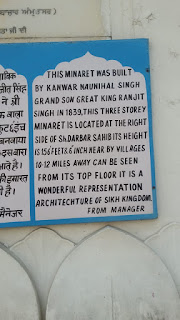 ' This minaret was built by Kanwar Naunihal Singh Grand son Great King Ranjit Singh in 1839, this three storey minaret is located at the right side of Sh. Darbar Sahib. Its length is 156 feet 6 inch nearby villages 10-12 miles away can be seen from its top floor. It is a wonderful representation architecture of Sikh Kingdom.